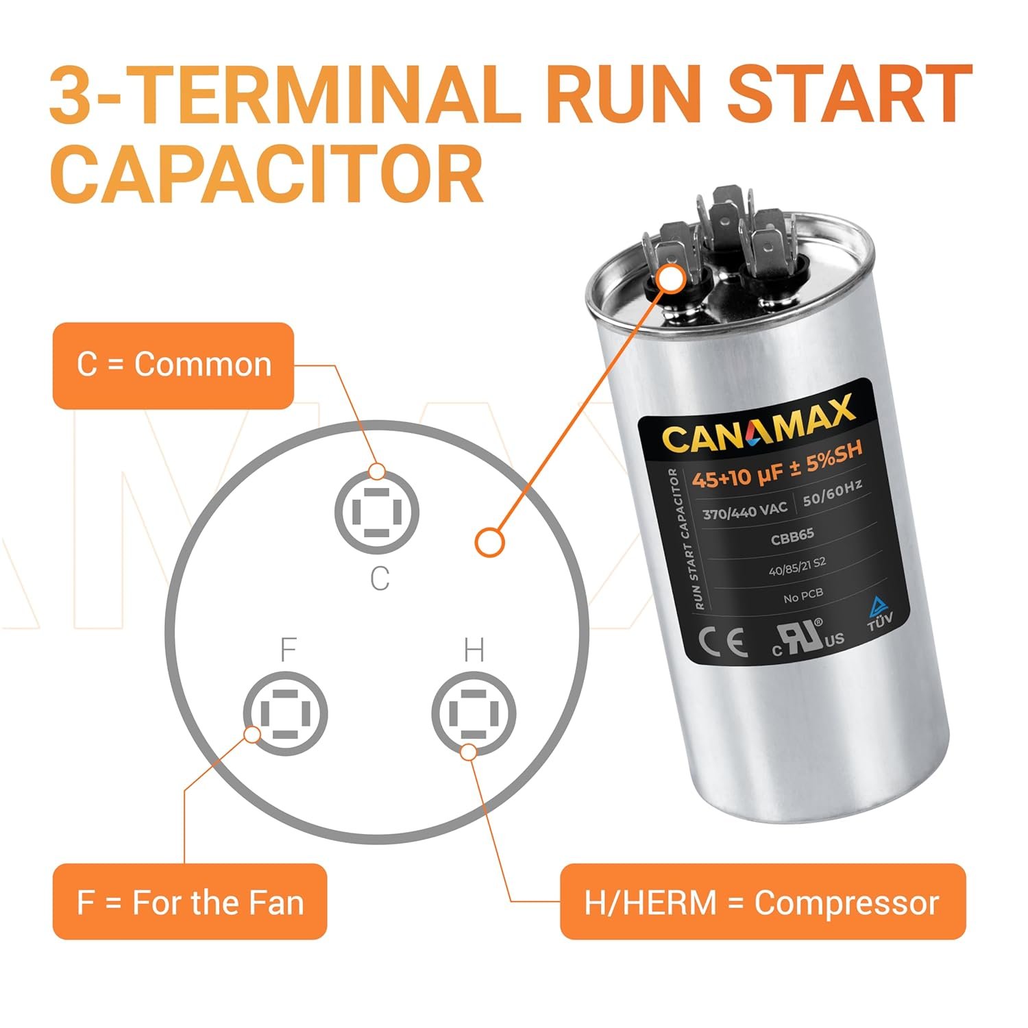 Canamax 45+10 uf ± 5% MFD 370 Or 440V Round Run Capacitor – Compatible with Air Conditioner 50/60Hz for AC Motor Run or Fan Start and Cool or Heat Pump Air Conditioner