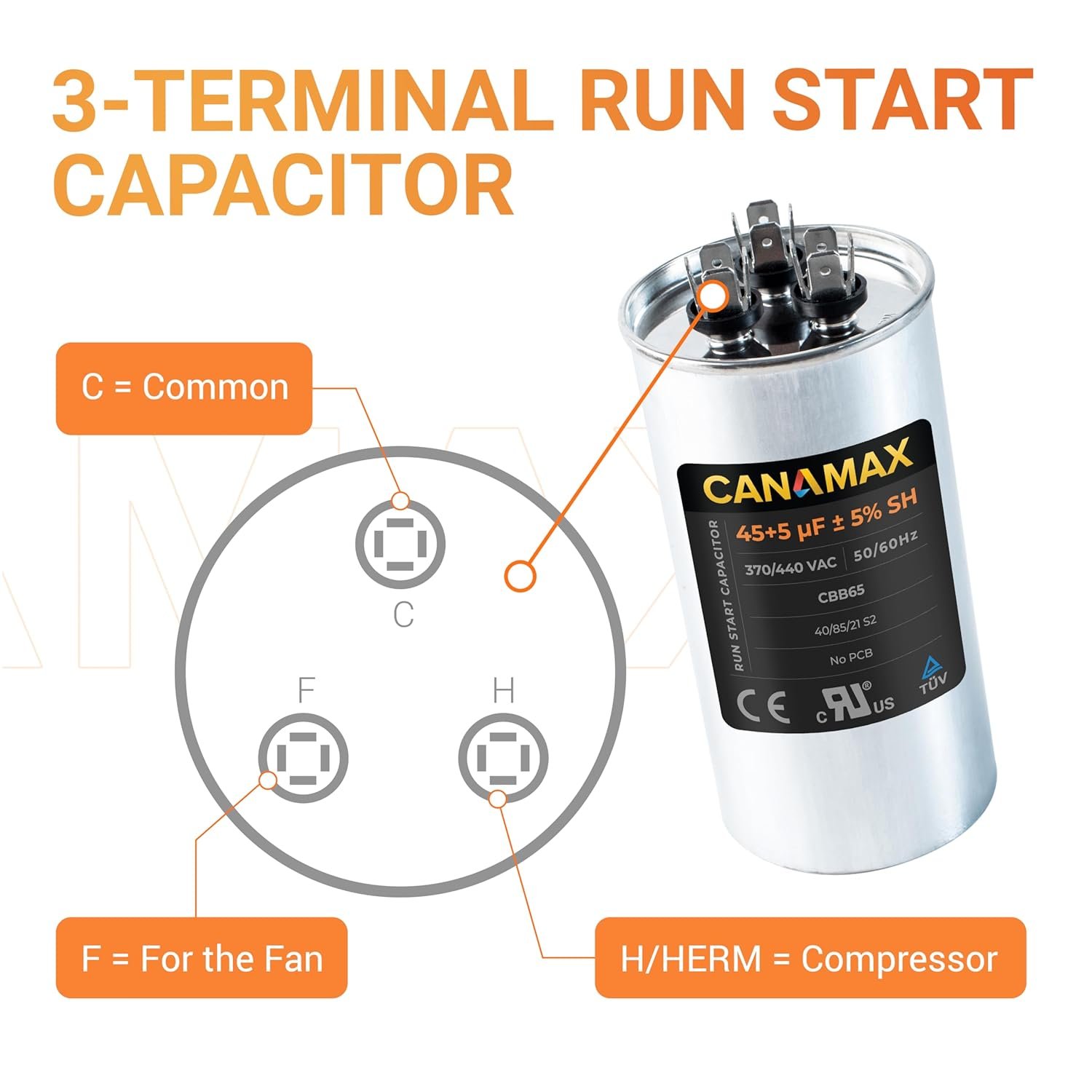 Canamax 45+5 uf MFD 370 or 440 Volt VAC Round Dual Run Capacitor – Compatible with Air Conditioner or Heat Pump Condenser